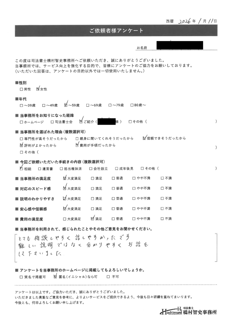 その他ご意見をお聞かせくださいとても相談しやすく話しやすかったです。難しい説明ではなく分かりやすくお話をして下さいました。